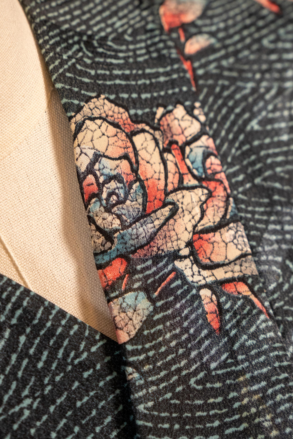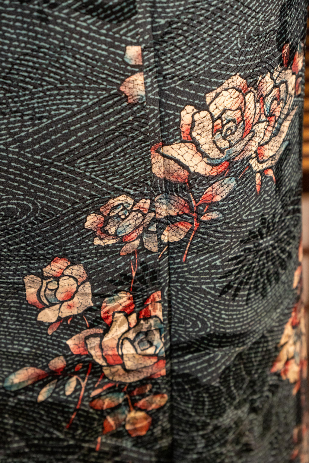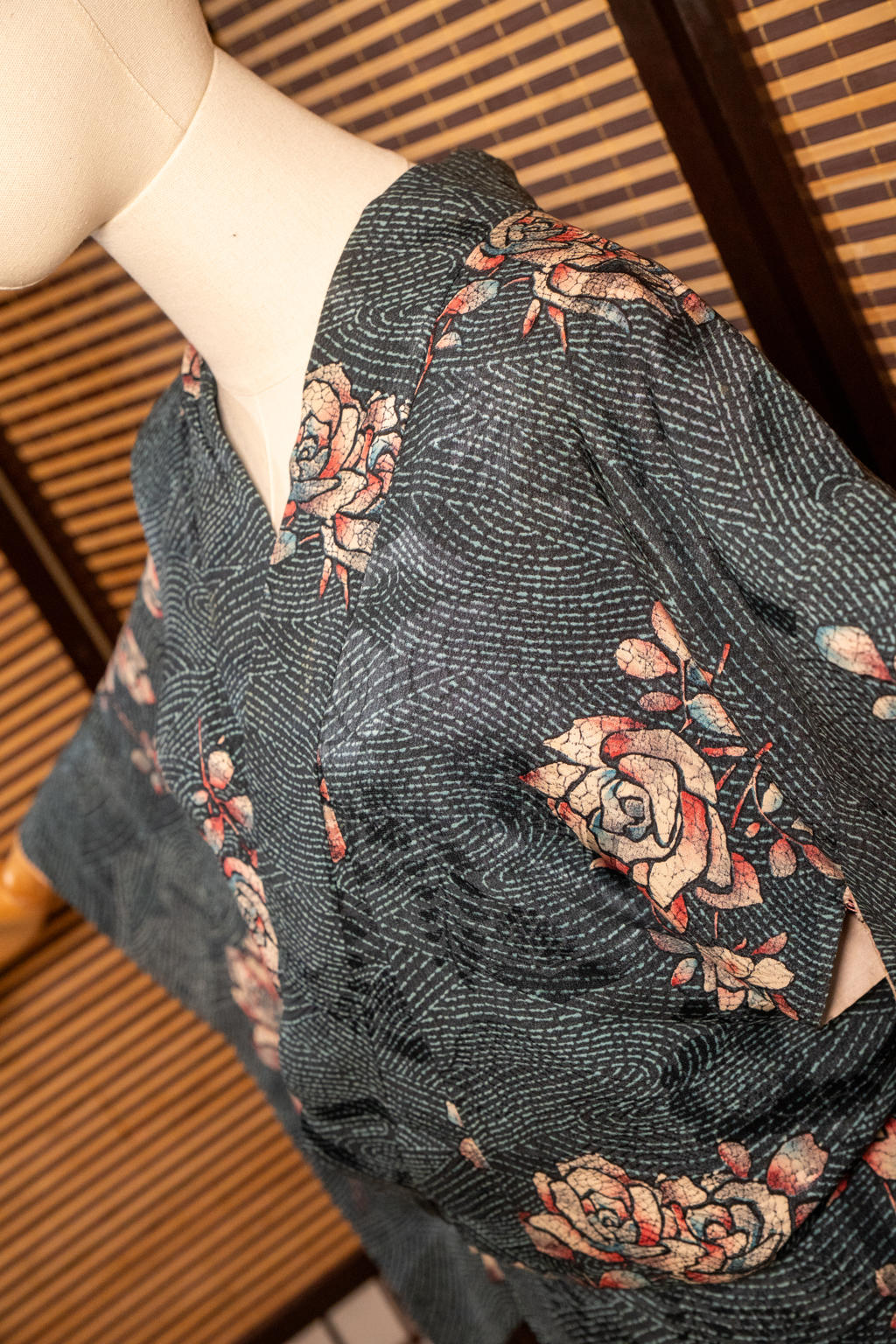 Ein wunderschöner, dunkelblauer Seidenkimono mit kunstvollem floralem Muster. Die feine Struktur der Seide ist leicht, angenehm glatt und trägt sich sehr elegant. Die Rosenmotive in zarten Rot‑ und Beigetönen wirken wie handgemalt und verleihen dem Kimono eine besondere Tiefe und Ausdruckskraft.