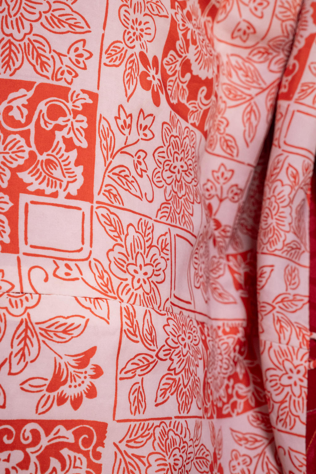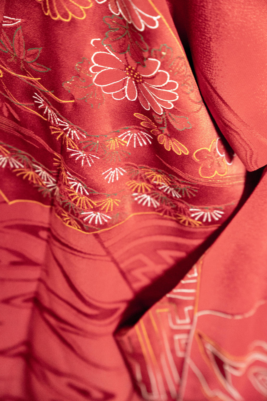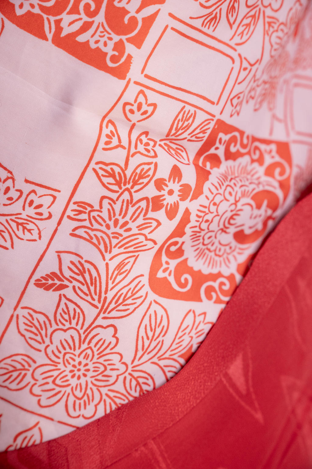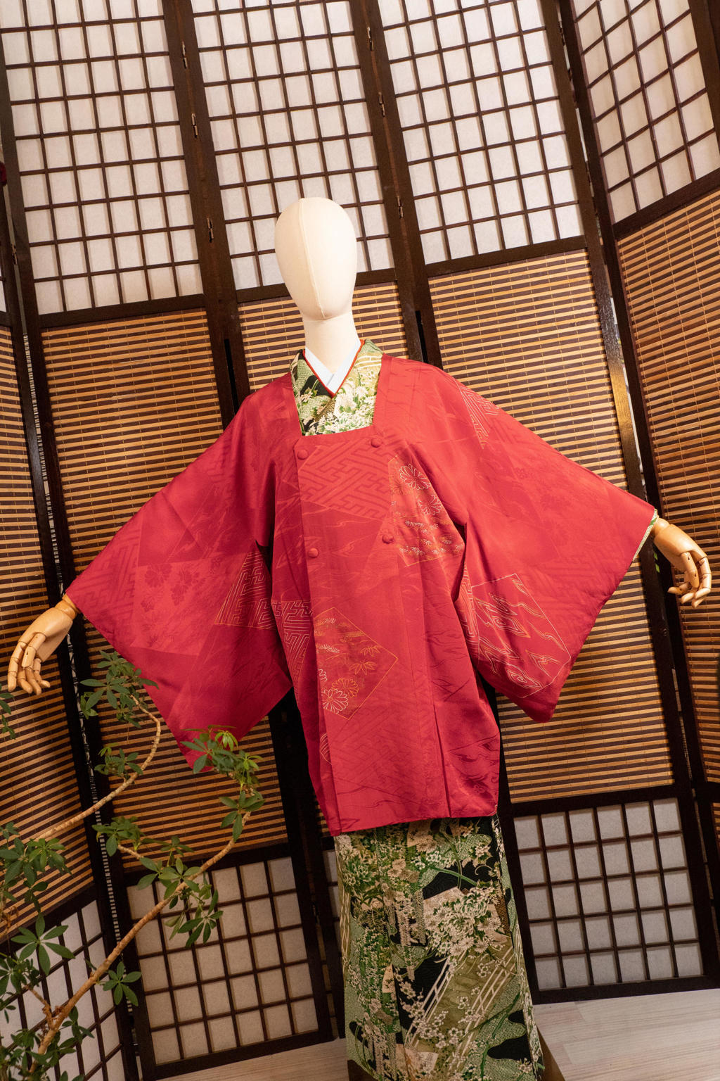 Ein wunderschöner, traditioneller Haori aus Japan in einem tiefroten Farbton mit eingewebten Mustern. Gefertigt aus reiner Seide und weich wie Samt auf der Haut, vereint dieses Kleidungsstück stilvolle Eleganz mit japanischer Kultur. Der Stoff schimmert dezent und wirkt durch das hochwertige Webbild lebendig und edel.