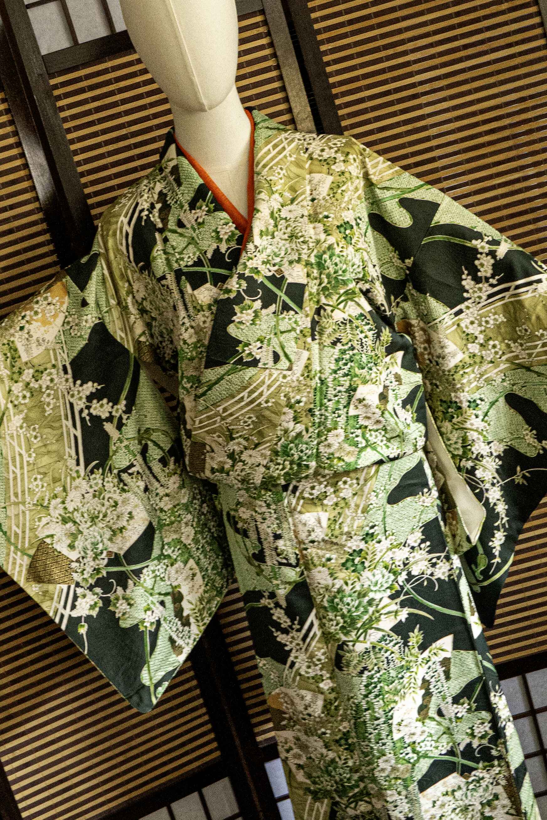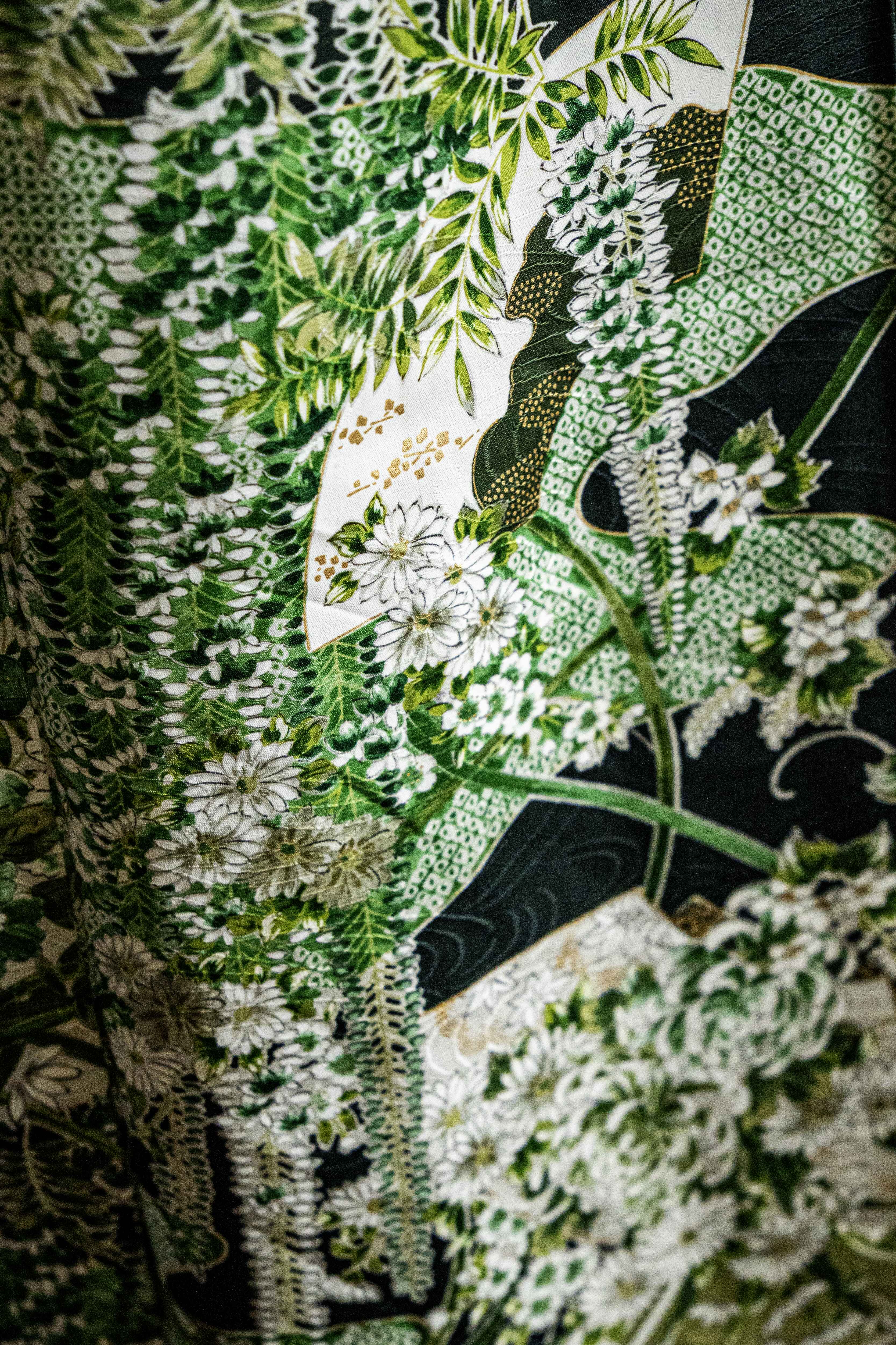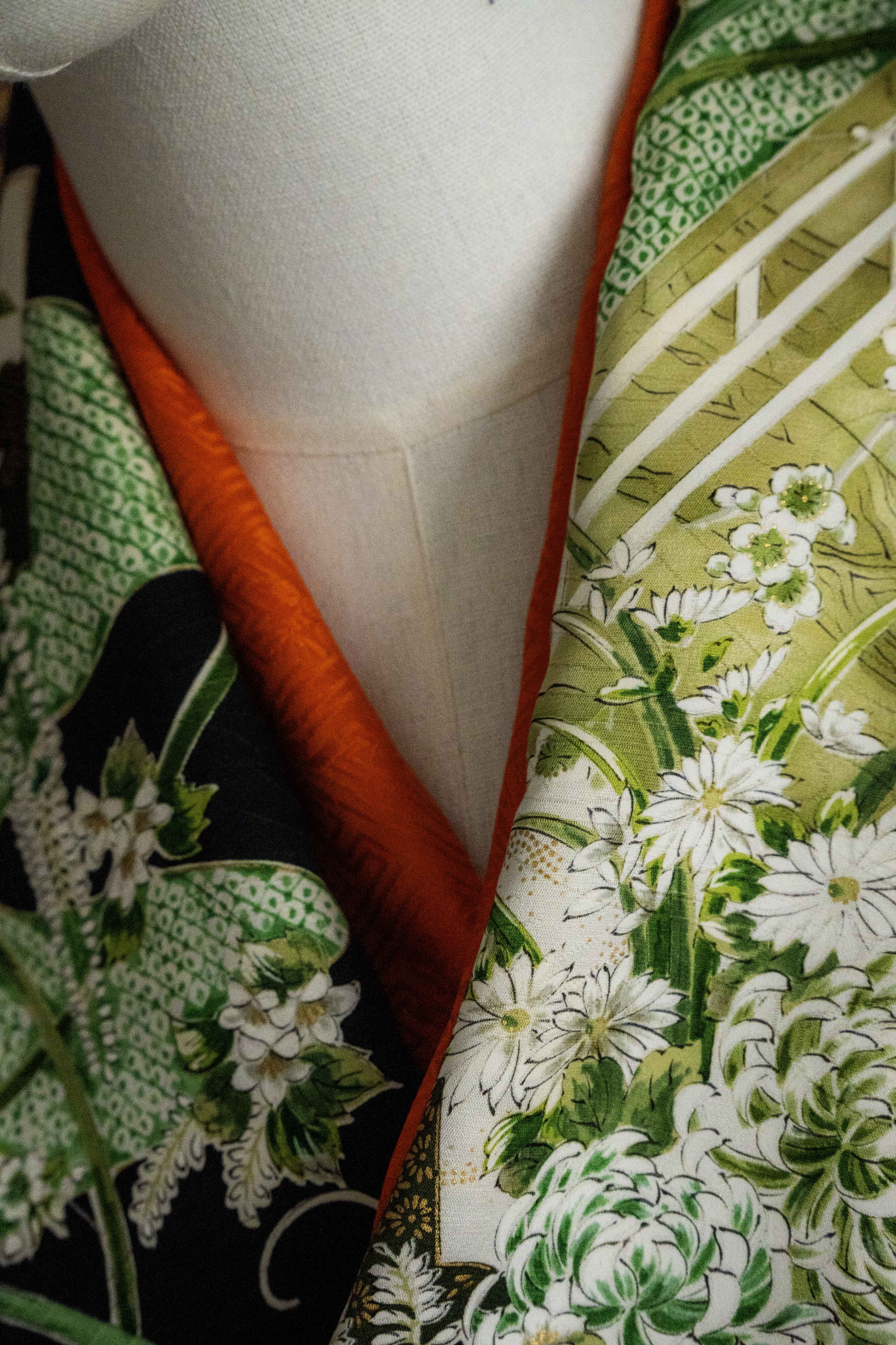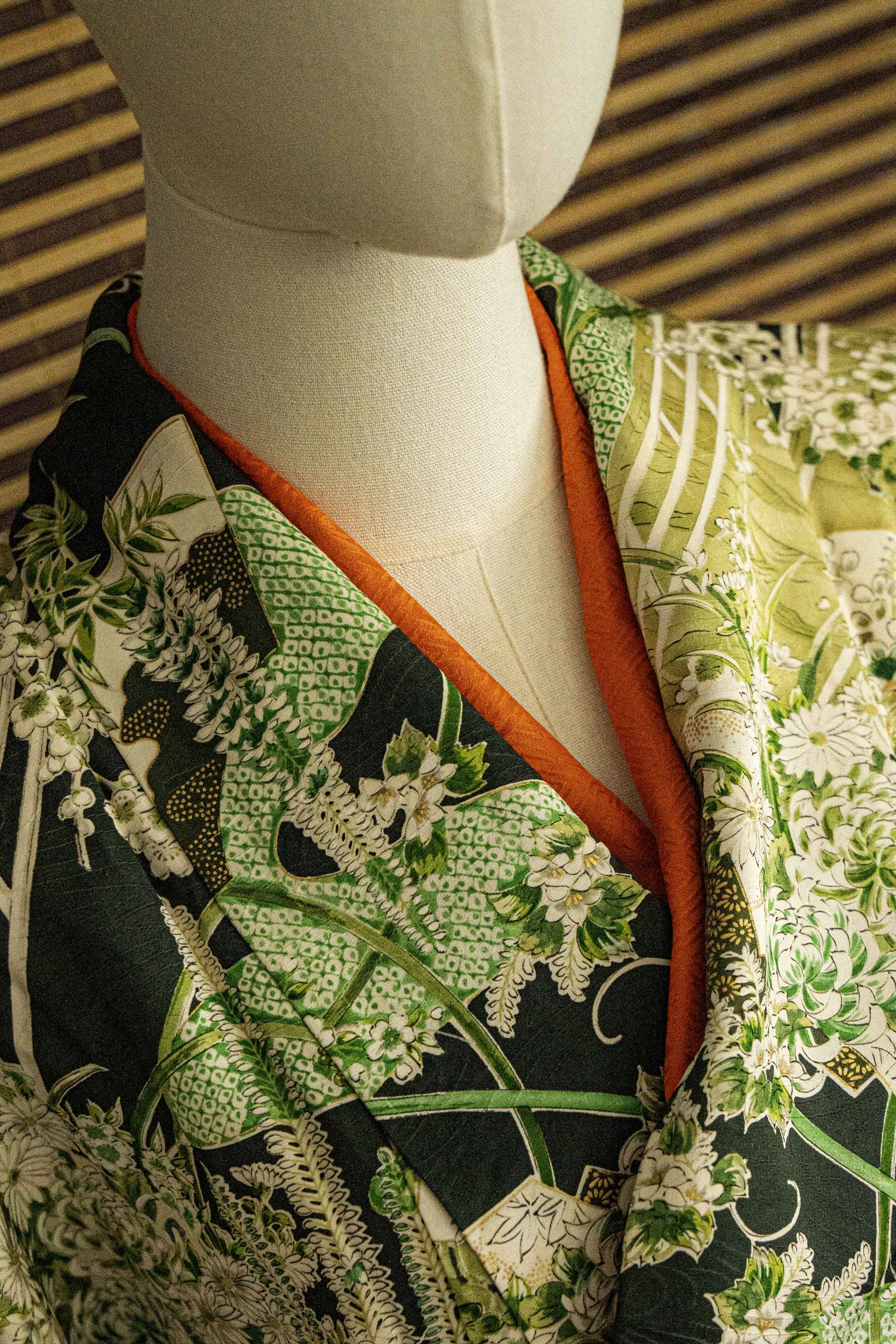 Dieser antike Komon-Kimono strahlt eine ruhige, elegante Tiefe aus: Ein sattes Smaragd- und Moosgrün bildet die Bühne für feine, weiße Blütenranken, zarte Blattwerke und dekorative Tanzaku-Elemente (schmale Gedichtstreifen) im traditionellen Stil. Dunkelgrüne Farbflächen und ein warm leuchtender, orange-roter Innenkragen sorgen für einen reizvollen Kontrast und machen das Muster besonders lebendig.
