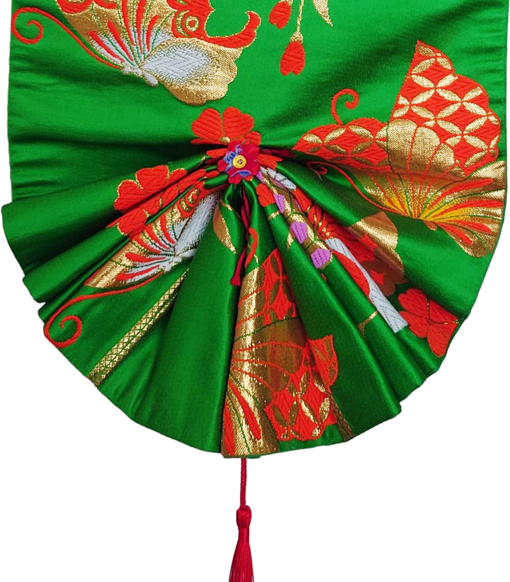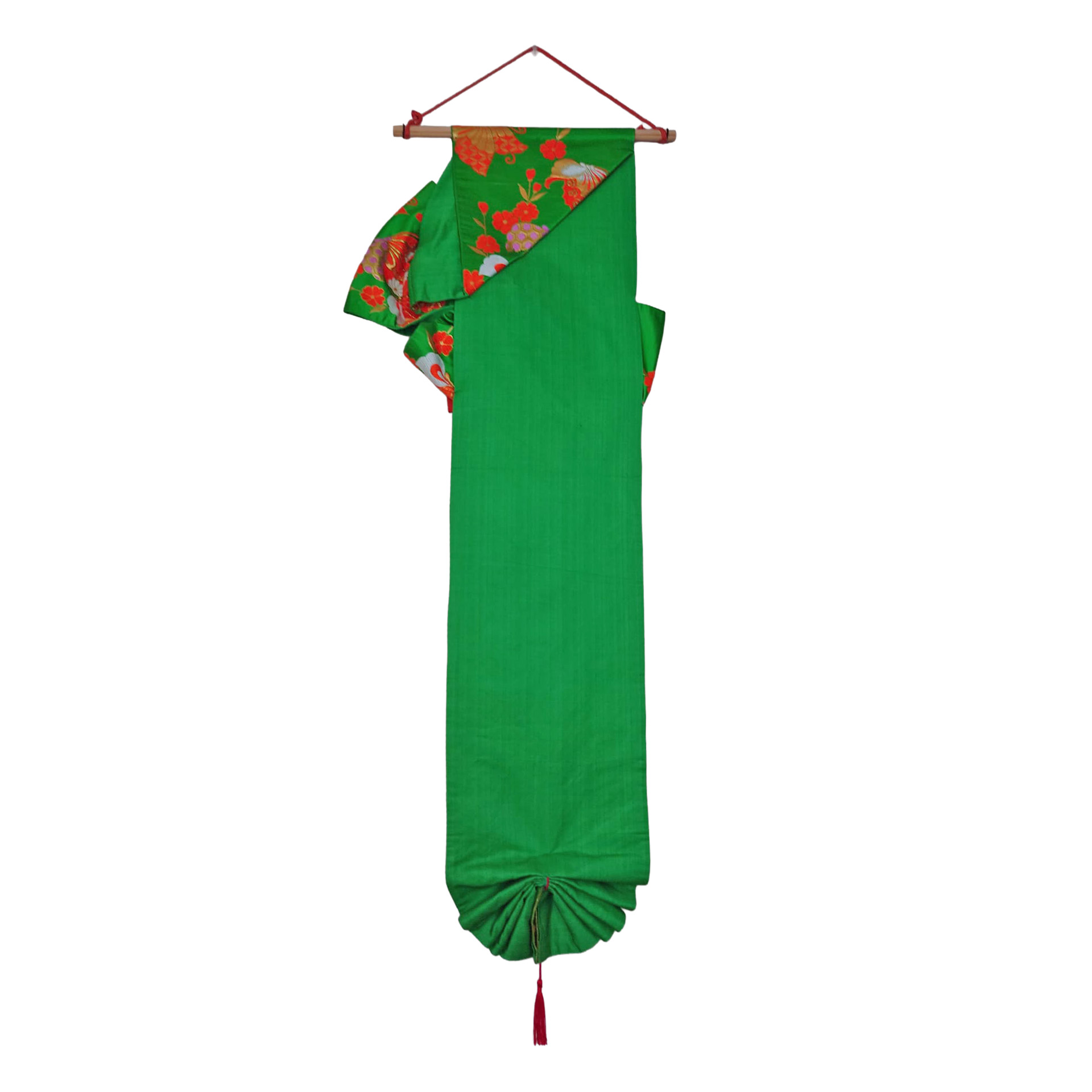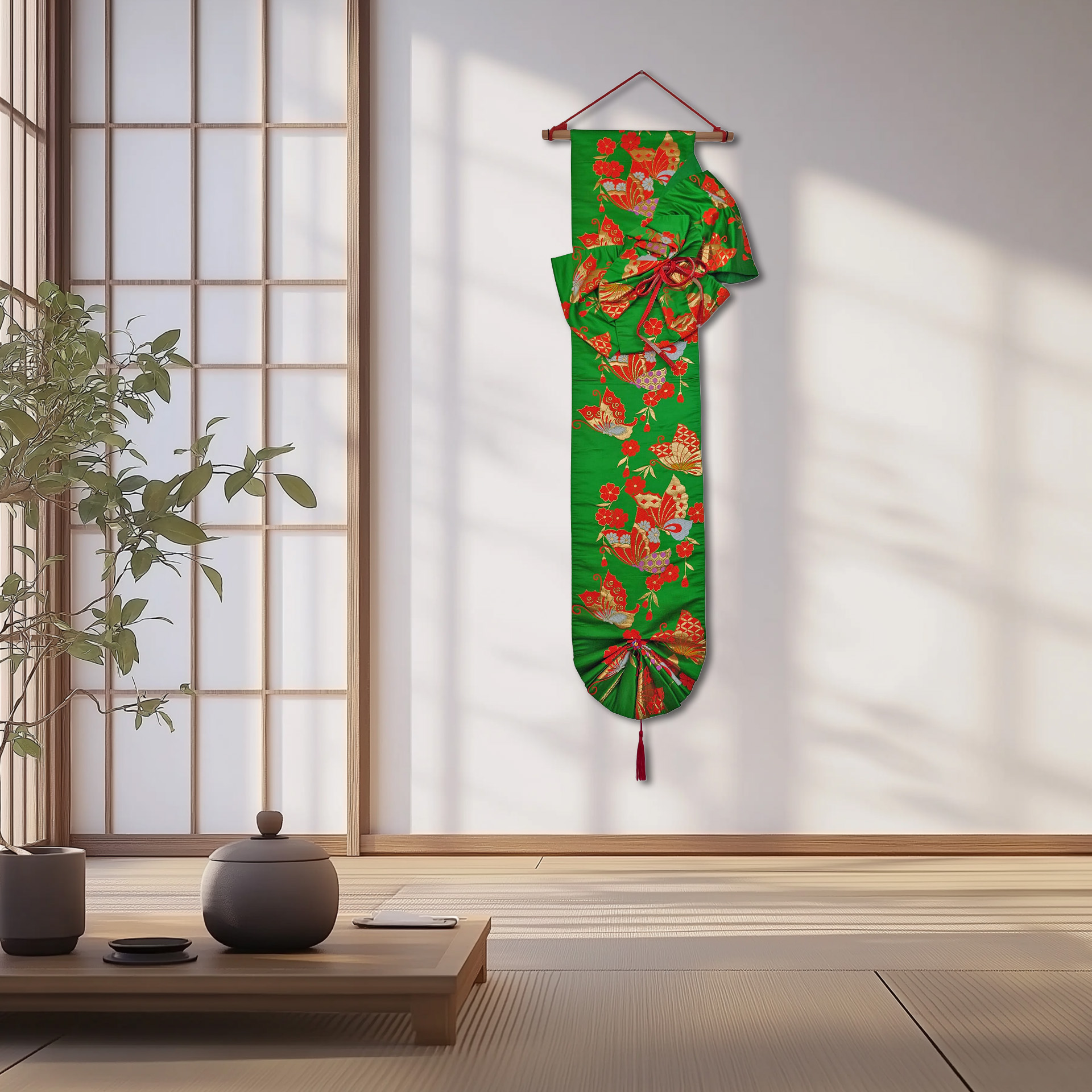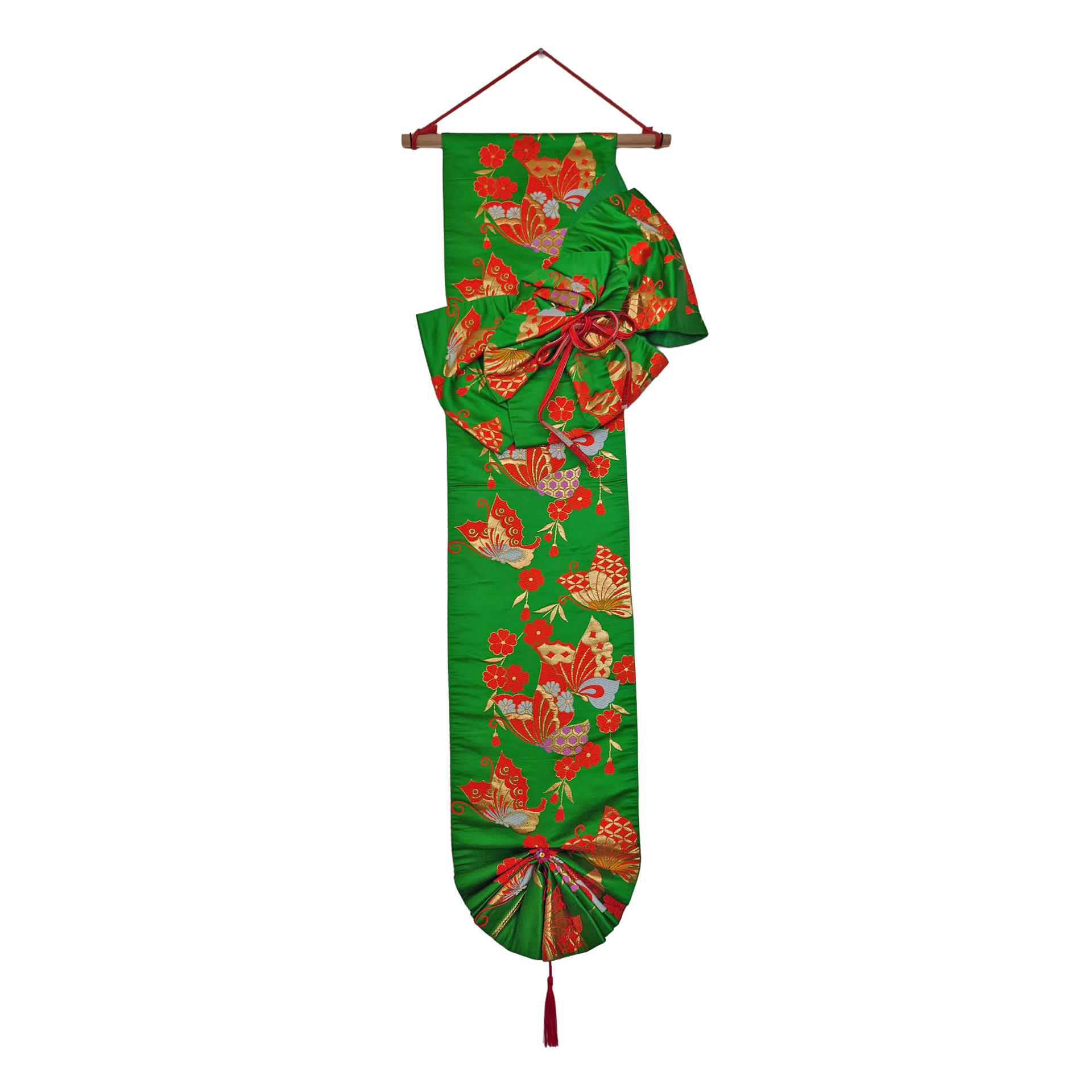 Ein farbenfroher, handgefertigter Wandbehang aus einem antiken Kinder-Obi: Das leuchtende Grün und ein verspieltes Schmetterlingsmotiv in Orange und Gold machen dieses Einzelstück besonders charmant. Die fein gefaltete Struktur sowie dekorative Quasten unterstreichen die hohe Kunstfertigkeit japanischer Textilgestaltung.