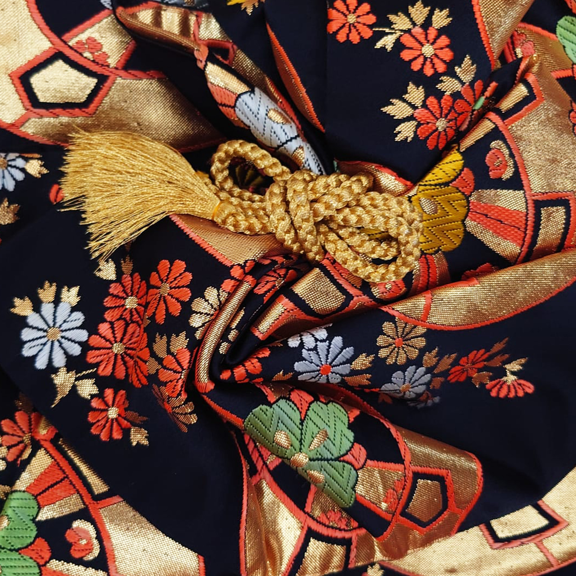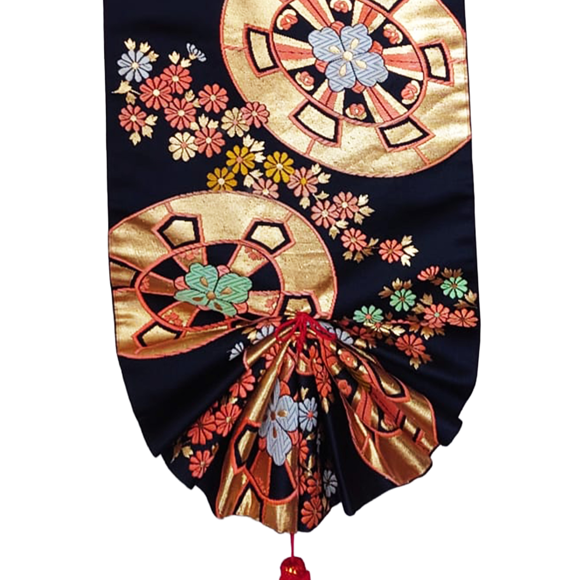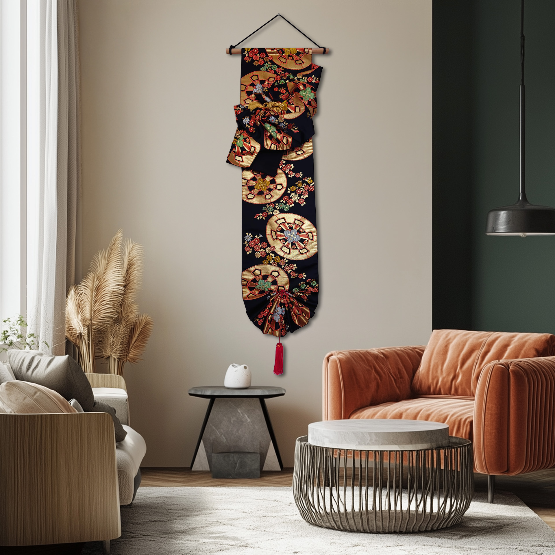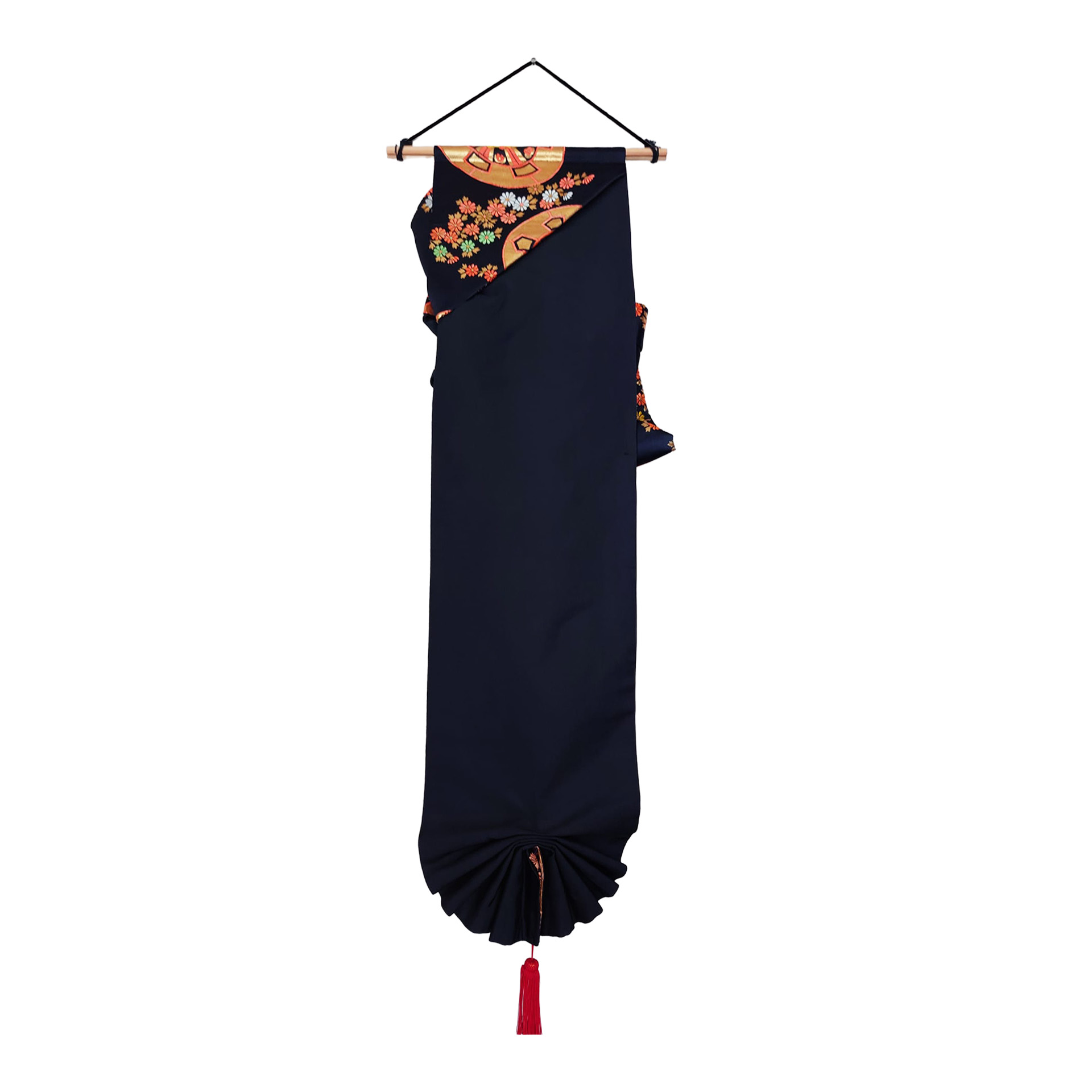 Ein charaktervoller Wandbehang aus einem antiken Kinder-Obi: Der schwarze Grundstoff ist mit einem ausdrucksstarken Muster in Orange und Gold durchzogen. Die handgelegten Falten und dekorativen Quasten unterstreichen die verspielte Eleganz und machen dieses Einzelstück zu einem besonderen Highlight traditioneller japanischer Textilkunst.