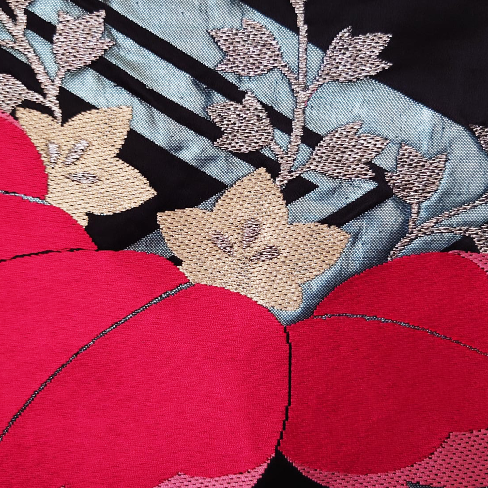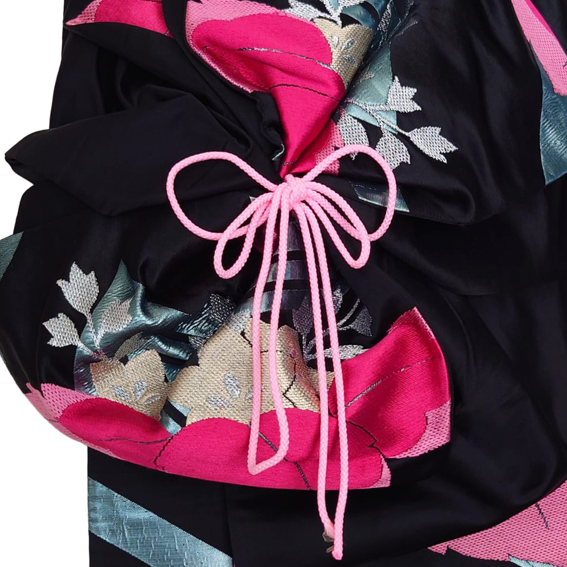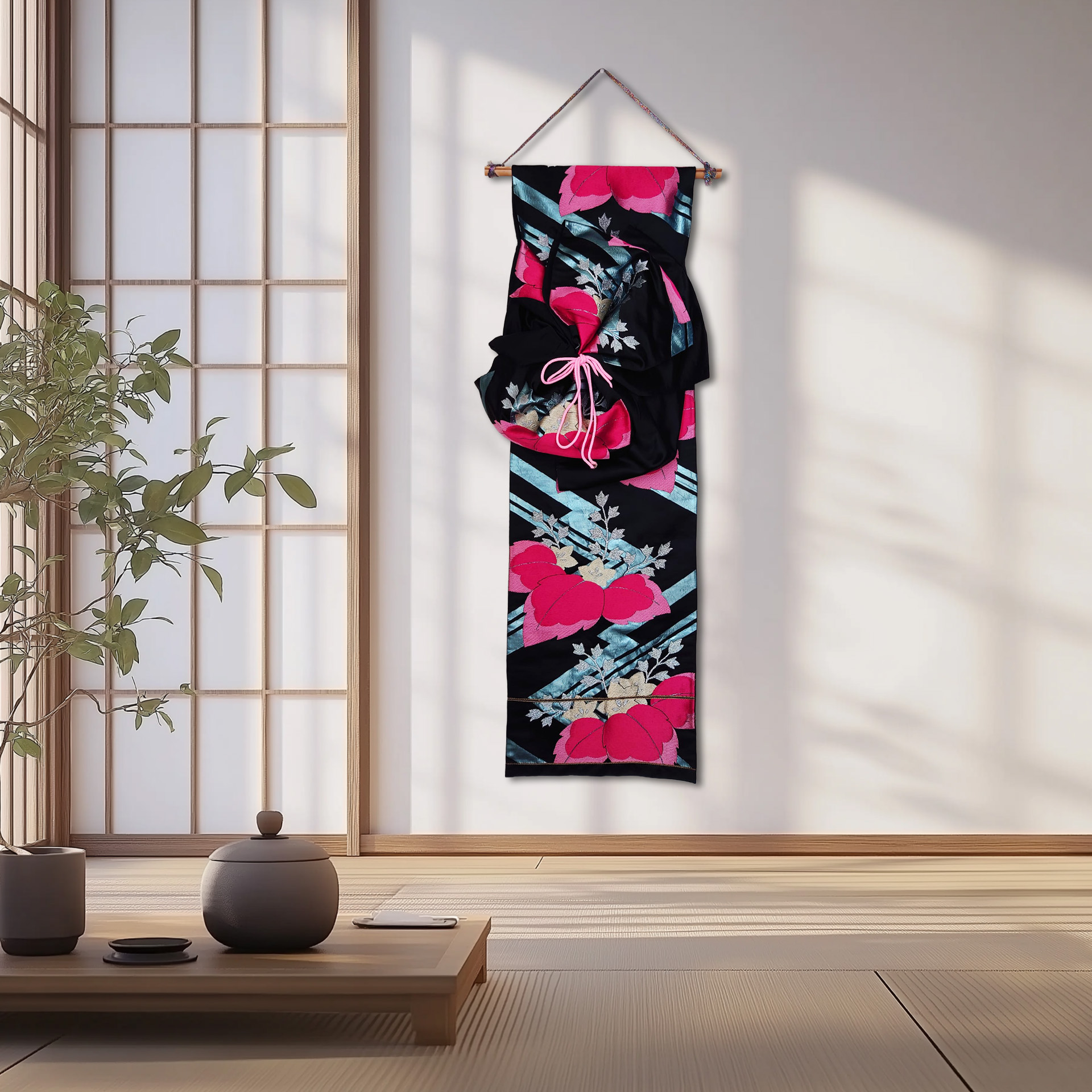 Ein eleganter Wandbehang aus einem antiken Nagoya-Obi mit einem verspielten Kiri-Blütenmuster (Paulownia) in zartem Pink auf schwarzem Grund. Die feine Seidenstruktur bringt das Design besonders zur Geltung und verleiht dem Raum eine stilvolle, japanisch inspirierte Atmosphäre.