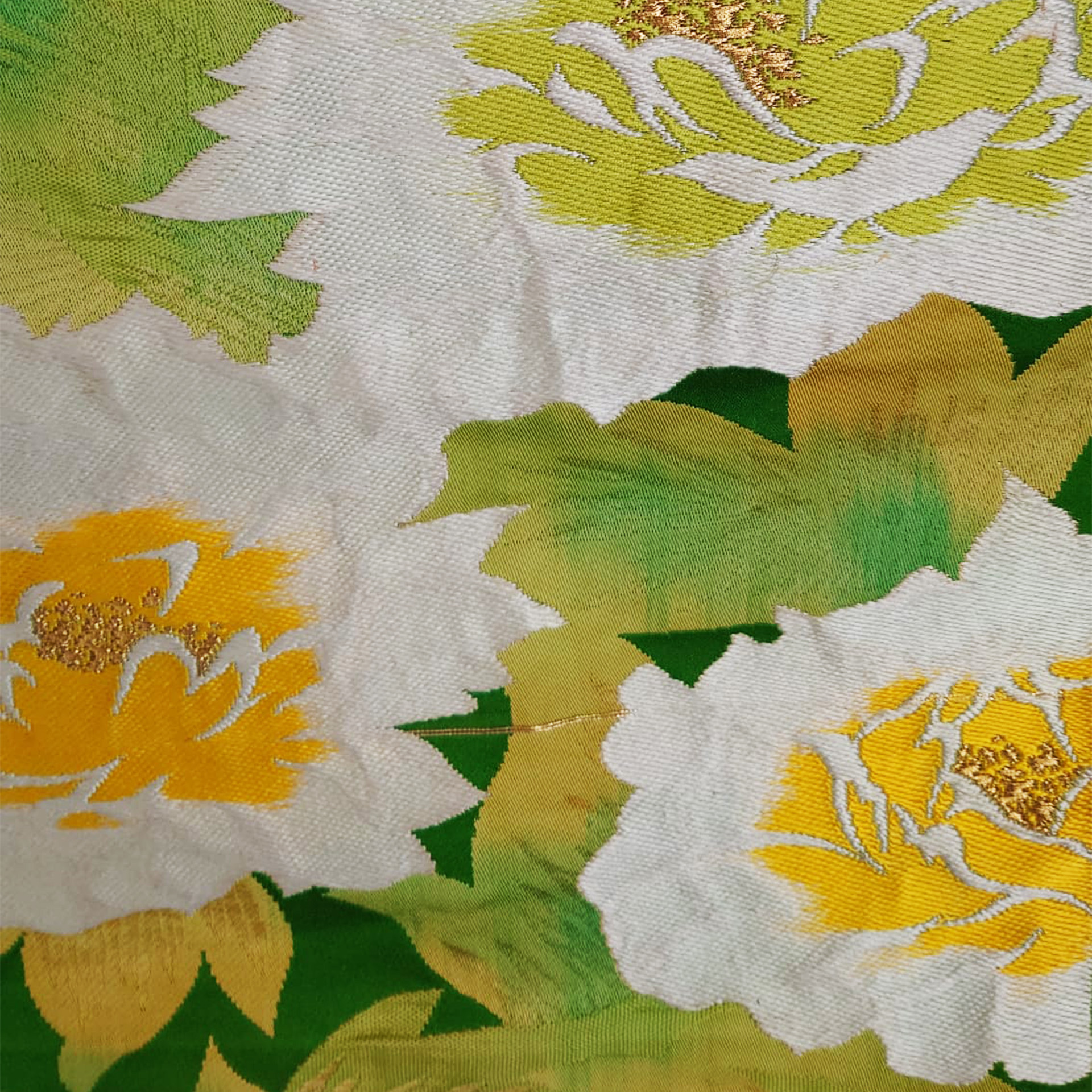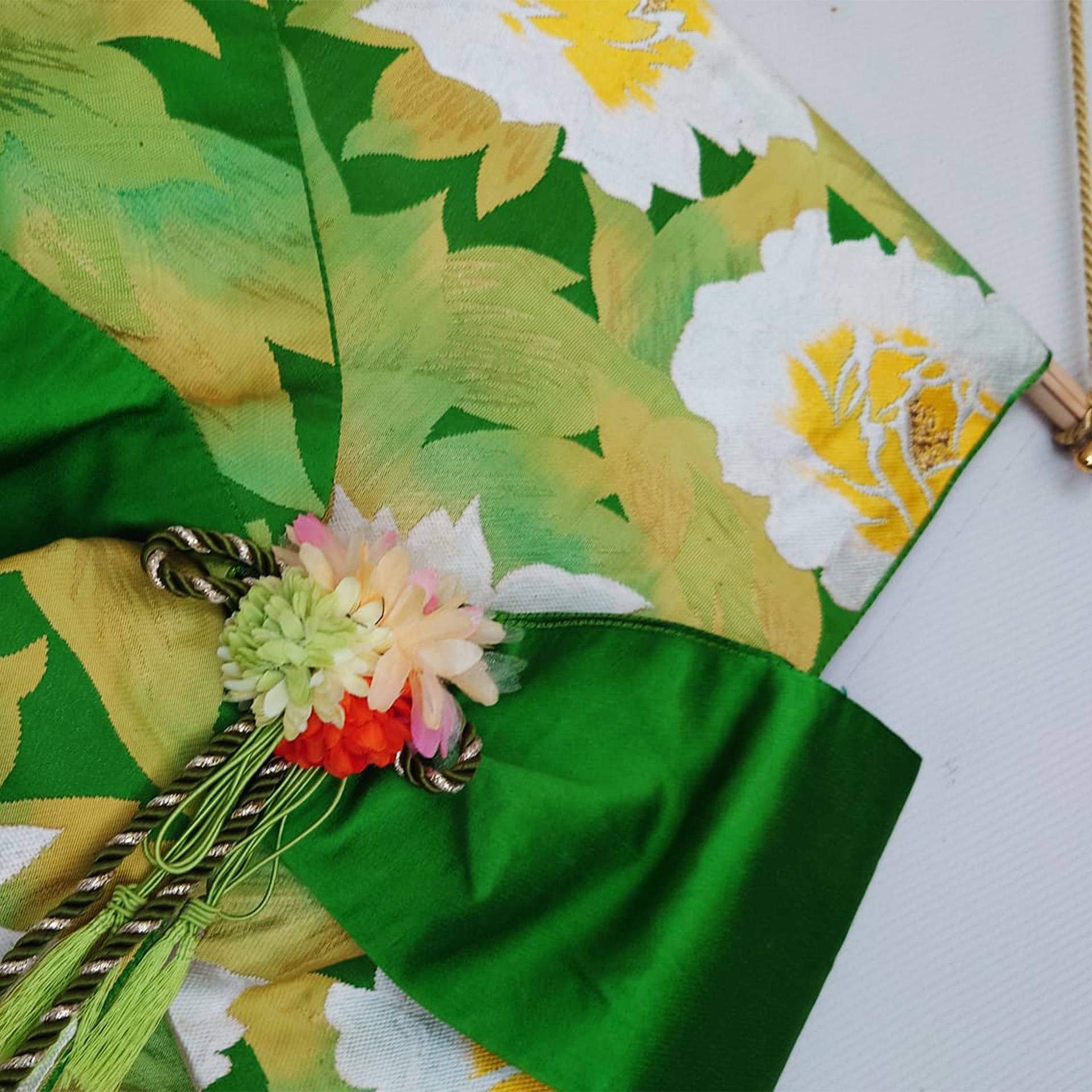 Um die natürliche Schönheit des Obis hervorzuheben, wurde der glatte Teil am Anfang des Nagoya-Obis als Akzent verwendet. Er ist bandförmig gestaltet, um Muster und Textur hervorzuheben. Er zeigt eine ausdrucksstarke Pfingstrose auf türkisgrünem Hintergrund.